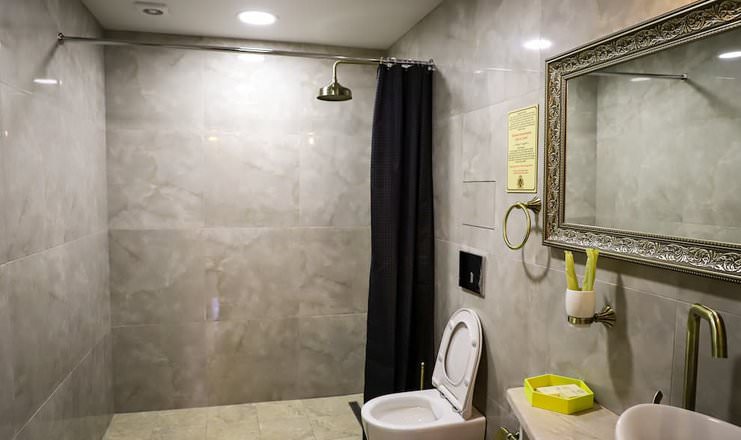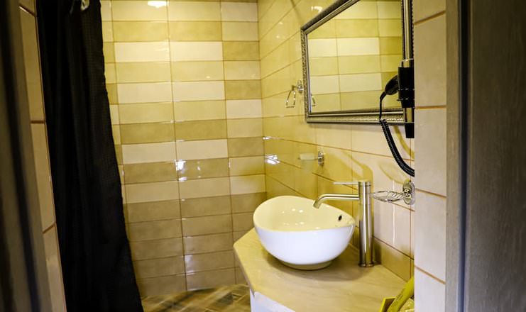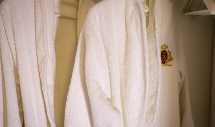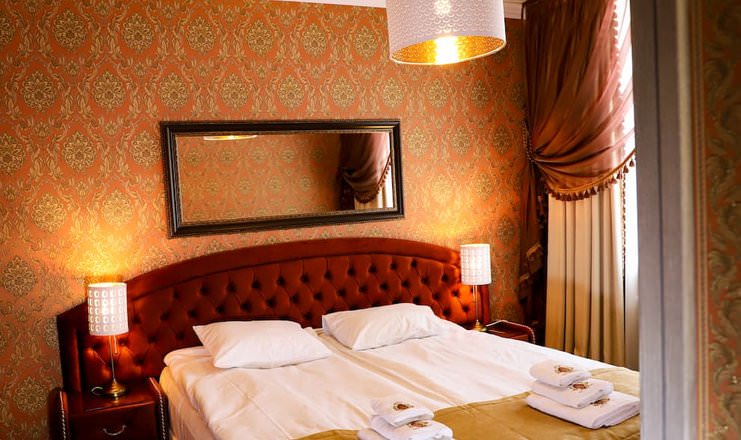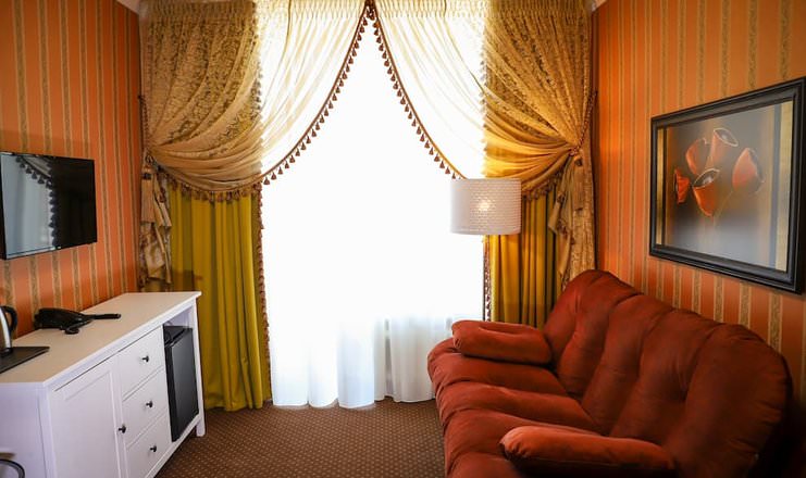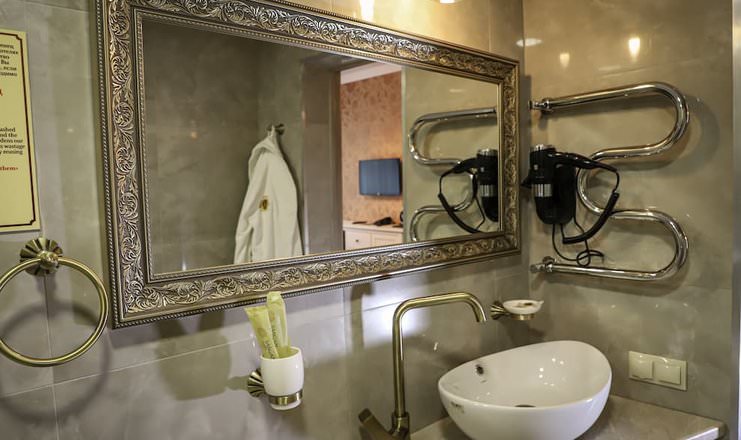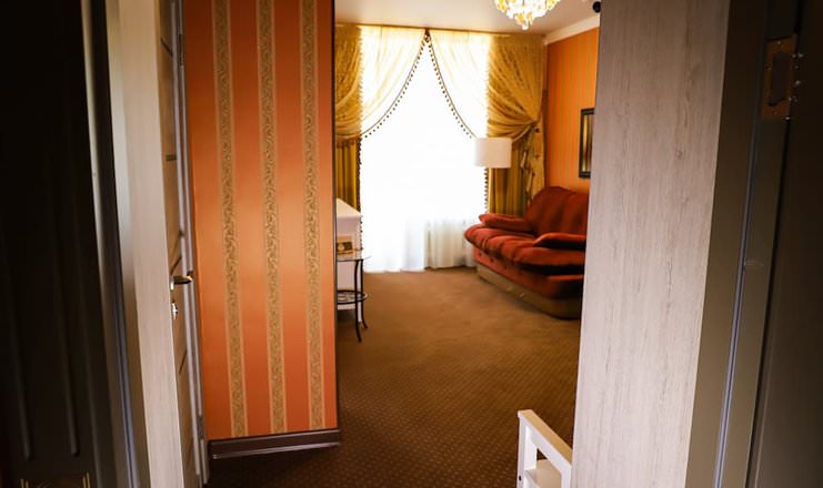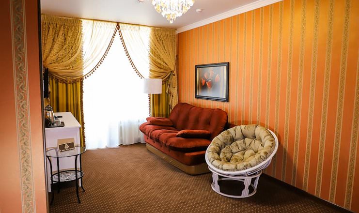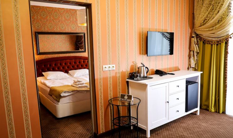 Двухкомнатный номер оборудован необходимой техникой, мягкой мебелью, косметическим набором с халатами и тапочками для гостей.