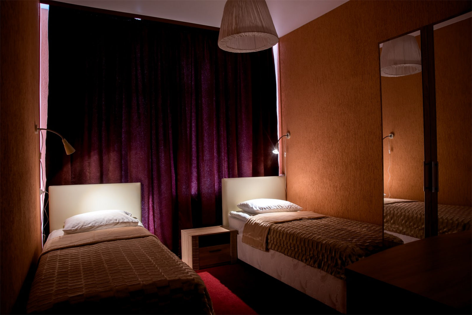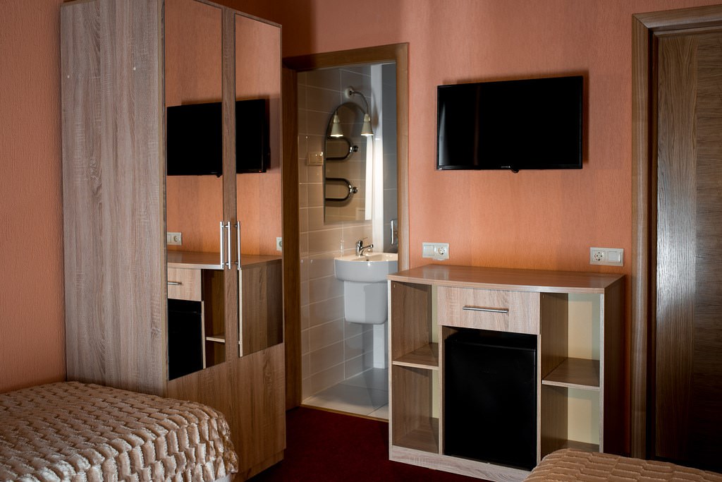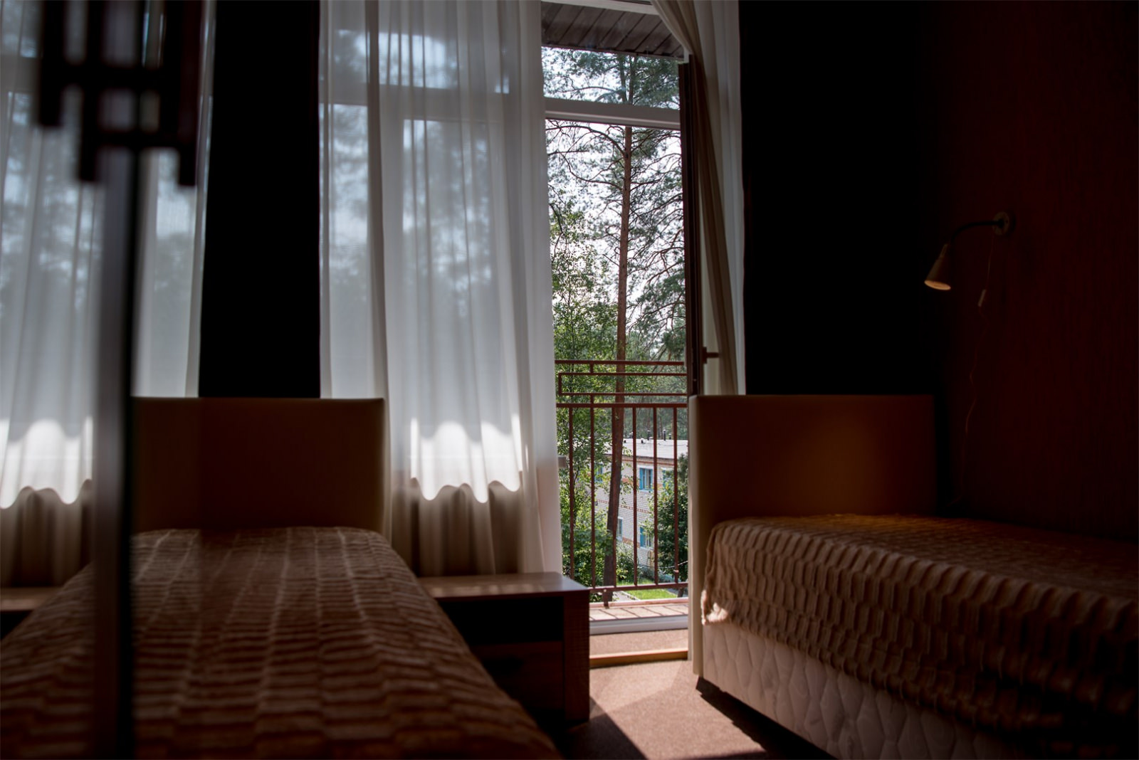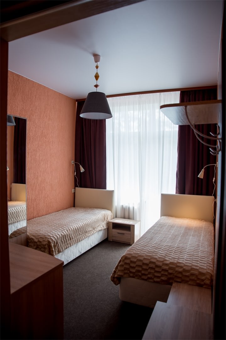 Номер легко вмещает в себя двух постояльцев: здесь есть две удобные кровати, собственный санузел, мини бар и плоский телевизор с 12 подключенными каналами. Интерьер в природной теплой гамме — то, что нужно, чтобы отдохнуть от городской спешки и полностью погрузиться в размеренную, неторопливую жизнь санатория. С личного балкона открывается вид на территорию и сосновый лес.