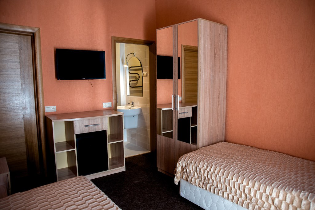 Номер легко вмещает в себя двух постояльцев: здесь есть две удобные кровати, собственный санузел, минибар и плоский телевизор с 12 подключенными каналами. Интерьер в природной теплой гамме — то, что нужно, чтобы отдохнуть от городской спешки и полностью погрузиться в размеренную, неторопливую жизнь санатория. С личного балкона открывается вид на территорию и сосновый лес.